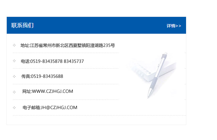 地址:常州市新北區友邦商務大廈1幢16、17層  電話:0519-85101652  傳真:0519-85112595  郵編:213022  網址:www.cz-jiayue_cn.jsdlipin.com  郵箱:xiajifengaa@163.com